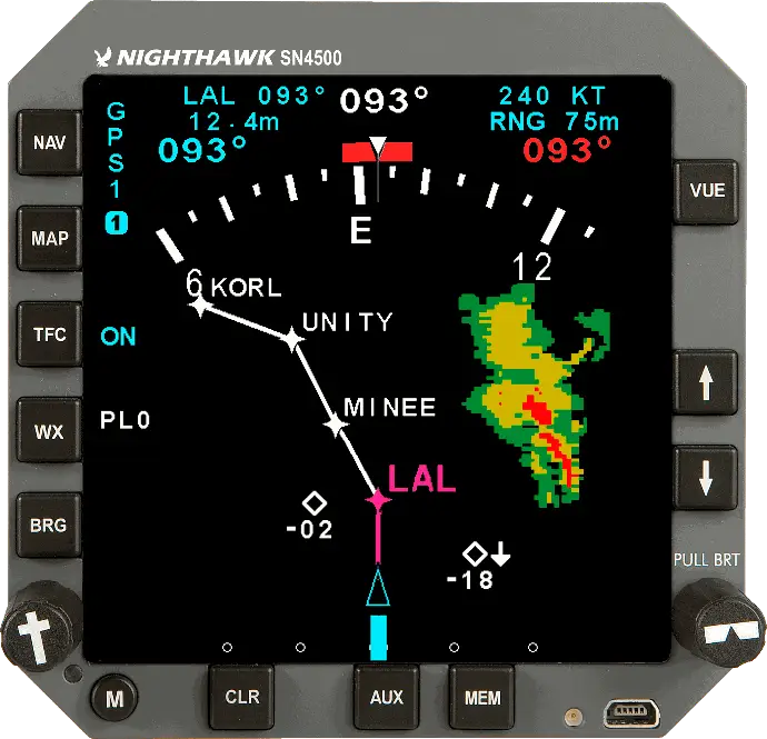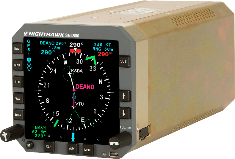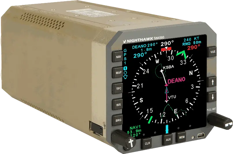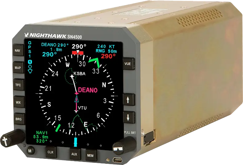 The SN4500 4×4 Primary Navigation Display upgrades your cockpit with the bright, wide-angle display technology found in the latest generation of aircraft. Boasting a high- reliability LED backlight, the SN4500’s display outperforms CRT and LCD screens, yielding unprecedented readability and ease of use. Simplifying navigation, the SN4500 also enhances safety with its standard Stormscope® and traffic. Available with night vision option and TACAN support as well.